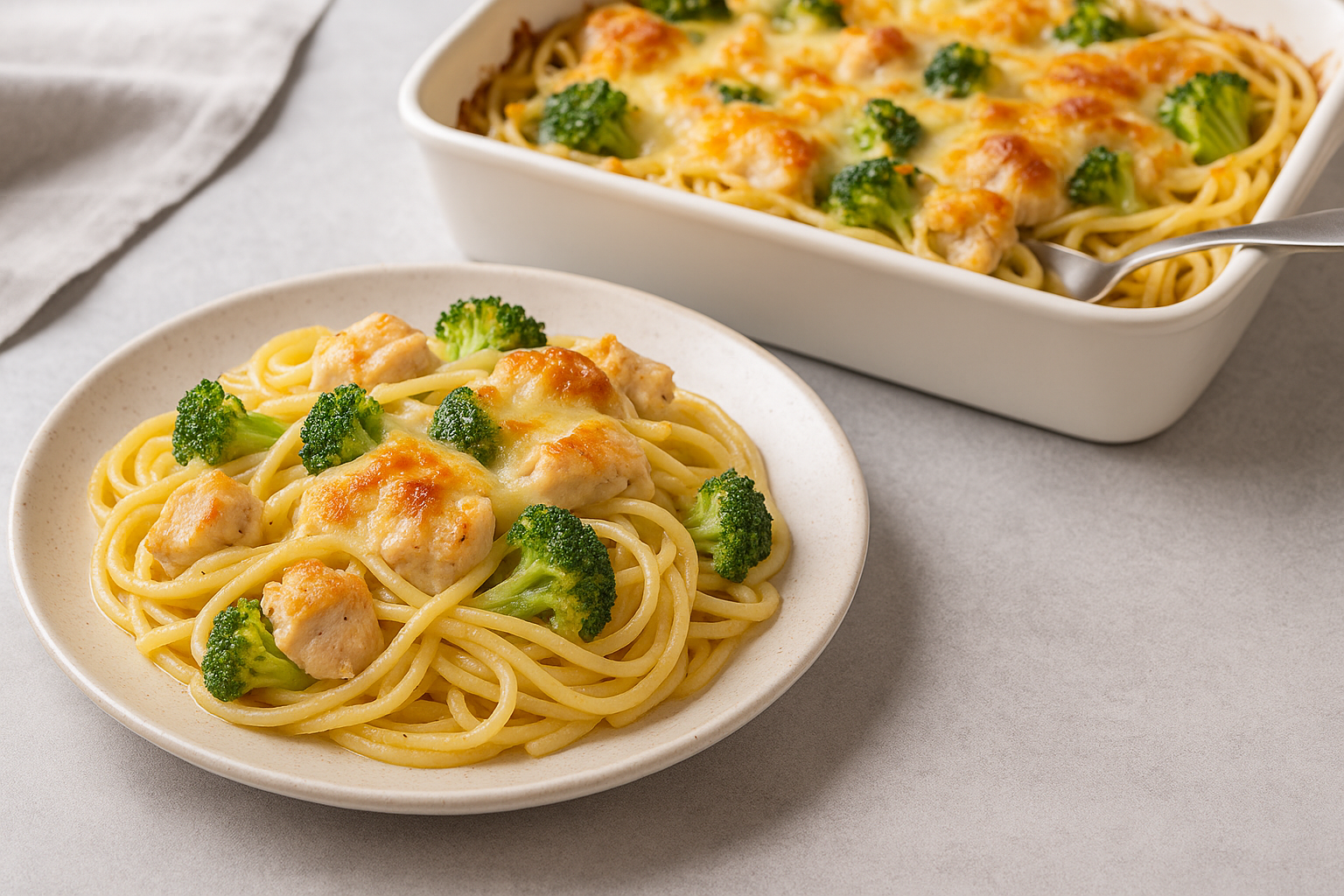 Zapečené těstoviny patří k oblíbeným pokrmům napříč kuchyněmi celého světa. Tento recept na špagety s kuřecím masem a brokolicí oceníte nejen pro jeho jednoduchost, ale i variabilitu. Brokolice dodá jídlu svěžest a lehkost, zatímco kuřecí maso zasytí. Smetanový základ se sýrem vytvoří lahodnou omáčku, která špagety obalí a zapeče se do zlatavé krusty. Jde o ideální večeři pro chladnější období, kdy přijde vhod něco teplého, rychlého a chutného.